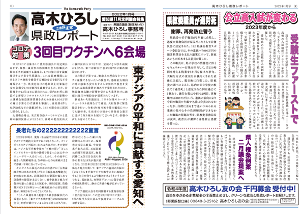 また、会期後半の12月13日に提出された、県内6か所に開設する新型コロナウイルスワクチン3回目接種の大規模会場設置事業費を含む868億9,000万円の補正予算など47議案を審議し、意見書6件と私学助成などの請願3件を、16日の閉会日に採択し閉会しました。