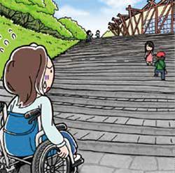 なかでも問題とされたのがメインエントランス(主な出入口)が高さ7m、幅40メートルに及ぶ大階段を昇ったデッキ上にあり、スロープもエスカレーターもなく、大階段に15人乗りの小型エレベーターがあるのみ。