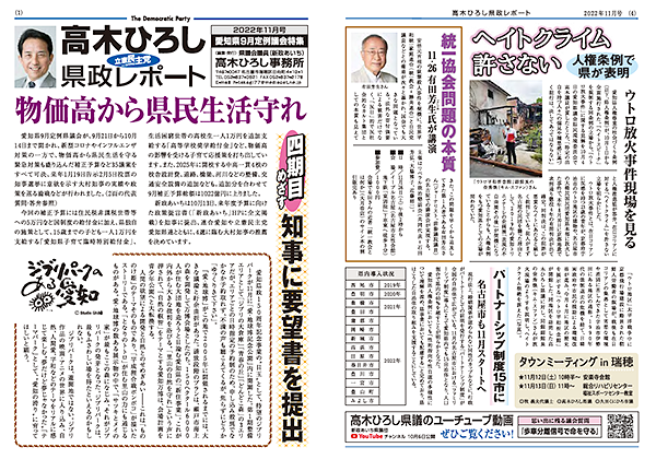 愛知県人権尊重の社会づくり条例(以下、県人権条例)が、10月1日から全面施行された。「ヘイトスピーチ」を規制する同条例の立場から、「ウトロ放火事件」に関する見解を10月4日の愛知県議会県民環境委員会で高木議員が質したところ、「特定の出自を持つ人々への偏見や嫌悪感に基づく犯行は、決してあってはならない」と人権推進監が答弁。在日コリアンに対する「ヘイトクライム」を許さない立場を明らかにした。