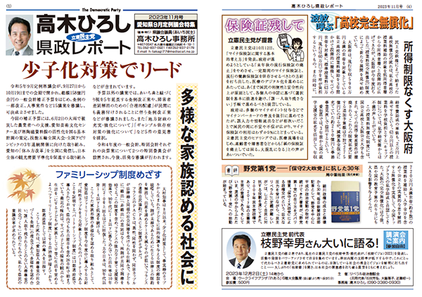 令和5年9月定例県議会が、9月27日から10月19日までの会期で開かれ、総額158億円余円の一般会計補正予算をはじめ、条例の一部改正、人事案件など15議案を審議し、可決成立させました。 今回の補正予算には、6月2日の大雨で被災した農業者への支援、愛知芸術文化センター及び県陶磁資料館の活性化を図る基本計画の策定、技能五輪全国大会・全国アビリンピックの3年連続開催に向けた取り組み、愛知の「休み方改革」を全国に発信し、日本全体の観光需要平準化を促進する取り組みなどが含まれています。 予算以外の議案では、あいち森と緑づくり税を5年延長する条例改正案や、障害者差別解消のための「合理的配慮」が民間にも義務付けされることに伴う条例改正案などが審議されました。また「地方財政の充実・強化について」「ギャンブル依存症対策の強化について」など5件の意見書を採択。 令和4年度の一般会計、特別会計それぞれの決算案について2つの特別委員会が設置され、今後、活発な審議が行われます。