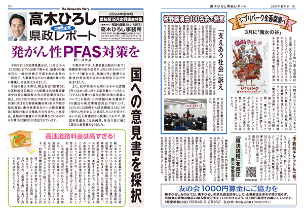 また、私学助成の充実にかかわる請願3件のほか、国に対する意見書の一つとして「PFAS(有機フッ素化合物)対策の推進について」を採択。この問題は高木議員が6月議会の県民環境委員会で取り上げ、12月1日には国際がん研究機関(IARC)が「発がん性がある」と認定したことを受けてあいち民主県議団から提案したもので、都