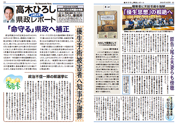 高木ひろし議員が旧優生保護法問題を取り上げた9月30日の県議会本会議には、国賠請求の原告である尾上敬子さん、一孝さん夫妻をはじめ多数の障害者や支援者が傍聴に詰めかけた。